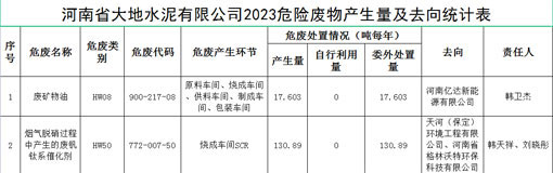 河南省大地水泥有限公司2023危險廢物產生量及去向統計表