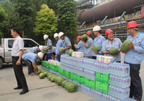 7月21日上午,縣總工會主席郭鵬飛帶領縣總工會部分工作人員到大地集團看望慰問一線職工,送去了礦泉水、綠茶、西瓜、毛巾等防署降溫用品,為廣大職工送去了夏日的清涼。圖為郭鵬飛主席親自為職工發放慰問品。