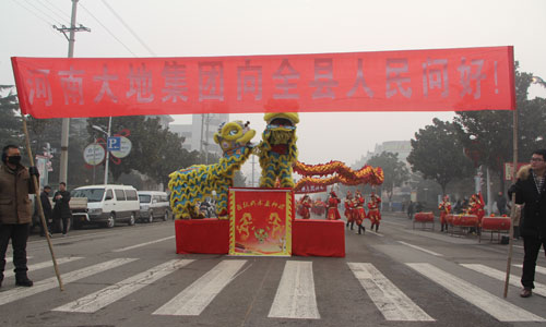 2月5日(農歷正月初九)上午,大地集團組織龍獅盤鼓隊參加寶豐縣第二十三屆民間藝術大賽。在縣城人民路縣委門前,“大地集團向全縣人們問好”的大紅條幅格外引人注目,精彩的龍飛獅舞不時引來觀眾的陣陣喝彩。 為搞好此項活動,大地集團聘請許昌市飛躍武術龍獅團前來參演,有聲有色,惟妙惟肖的表演為我縣民間藝術大賽增添了亮點,增加了藝術種類,活躍了現場氣氛。龍獅舞起來,鑼鼓敲起來,上下翻飛騰騰而起的巨龍搖頭擺尾,象征著大地集團的熱烈紅火的發展前景;雙獅追逐嬉戲,你追我趕,活靈活現,預示著大地集團的無限生機與活力;盤鼓高亢有力的宏音,好似催促著大地集團全體干部職工再向新目標進發。精彩的表演吸引了大批觀眾,將演出現場圍攏得水泄不通,一個個拿出手機拍照錄像……。 之后,全體演職人員乘車來到大地集團慰問演出,在大地公司門口擺開龍門陣,精彩的《龍騰獅躍》《雙獅鬧春》為廣大干部職工獻上一場精彩的視覺盛宴,贏來陣陣掌聲。
