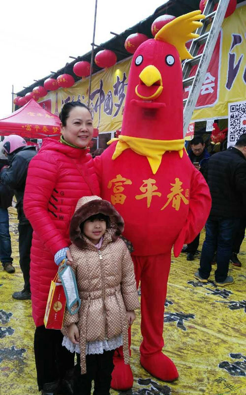 一位中獎女士與吉祥物金雞合影 “非常感謝富平春為我們帶來了驚喜,帶來了情趣”,位剛剛中得一等獎的小伙高興地把他中獎的消息發到了朋友圈。