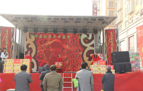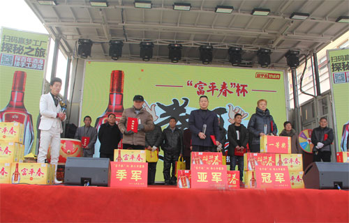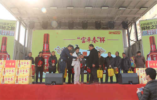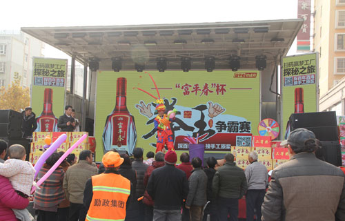 11月30日上午,“富平春”杯拳王爭(zhēng)霸寶豐站總決賽在德信泉百貨廣場(chǎng)激情開(kāi)戰(zhàn), 伴隨著主持人精彩的開(kāi)場(chǎng)白,拳王爭(zhēng)霸總決賽正式拉開(kāi)帷幕。 為傳承酒令文化,感受當(dāng)?shù)孛袼作攘ΓS富百姓文化生活,賈湖酒業(yè)集團(tuán)在各個(gè)銷(xiāo)售區(qū)域搭建“拳王爭(zhēng)霸”賽事平臺(tái),比賽內(nèi)容主要是以劃拳比勝負(fù)。寶豐作為比賽的第一站,該活動(dòng)得到了廣大人民群眾的熱烈響應(yīng),自11月份開(kāi)辦以來(lái),報(bào)名參賽人數(shù)達(dá)500多人,通過(guò)在石橋、大營(yíng)、楊莊等鄉(xiāng)鎮(zhèn)的6場(chǎng)海選,最終選出15名選手進(jìn)入總決賽。經(jīng)過(guò)幾輪緊張而激烈的角逐后,城關(guān)鎮(zhèn)的陳伏最終榮獲冠軍;城關(guān)鎮(zhèn)的林帥榮獲亞軍;商酒務(wù)鎮(zhèn)的盧白孩榮獲季軍,并獲得了賈湖酒業(yè)為他們準(zhǔn)備的價(jià)值不菲的富平春酒。 活動(dòng)現(xiàn)場(chǎng)還穿插了精彩的歌舞、魔術(shù)等節(jié)目,嘻哈大師更是前來(lái)助興,用氣球現(xiàn)場(chǎng)變出一個(gè)個(gè)生靈活現(xiàn)的小動(dòng)物,贈(zèng)送給現(xiàn)場(chǎng)的來(lái)賓和小朋友,加上賈湖酒業(yè)為大家免費(fèi)發(fā)放的精美禮品,引來(lái)現(xiàn)場(chǎng)觀眾的哄搶?zhuān)麄€(gè)活動(dòng)現(xiàn)場(chǎng)異常火爆、氣氛熱烈。