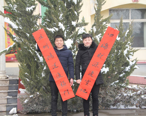 隨著春節的臨近,1月26日上午,寶豐縣香山書社走進大地集團開展義寫春聯活動,提前送上新春祝福,受到廣大職工的熱烈歡迎。這是多年來,大地集團與寶豐縣香山書社聯手,讓書法走進企業,讓藝術助力企業文化建設的又一活動。 雖然外面冰天雪地,大地集團一樓會議室卻熱鬧非凡,翰墨飄香,寫春聯的案桌圍滿前來欣賞的職工們,有的在精心挑選自己喜歡的春聯,有的主動幫忙疊紅紙、扶春聯、晾春聯, 現場一片歡聲笑語,喜氣洋洋。書法家們屏氣凝神,揮毫潑墨,一幅幅行云流水、遒勁有力、瀟灑俊逸的書法作品躍然紙上,象征著吉祥、喜慶、富貴,平安的春聯,贏得大家的交口稱贊和爭相索要。半天功夫,300多幅春聯被一搶而空。 “毛筆寫的春聯更有意義、更有年味”。一位員工拿著剛寫好的春聯愛不釋手。此項活動不僅傳遞著廣大員工對新年的美好期盼,也讓員工感受到集團的人文關懷,營造溫馨和諧的新春文化氛圍。 義寫春聯現場
