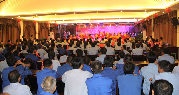 火紅的秧歌扭起來,歡快的舞蹈跳起來。2012年9月26日晚,大地集團“慶國慶,迎中秋”文藝晚會在大地公司會議室隆重舉行。 集團董事長張彪到會致辭,縣委宣傳部馬麗部長應邀到會場并發表了重要講話、縣總工會郭鵬飛主席等領導觀看了演出,公司領導、各部門代表及職工家屬共500多人觀看了演出。 晚會在婀娜多姿,喜氣洋洋的開場長綢扇舞《歡天喜地》中揭開序幕。“我和我的祖國一刻也不能分割,無論我走到哪里……”來自中控室的王亞旭、郭慧娟合唱的《我和我的祖國》,聲情并茂,催人奮進,在現場產生強烈共鳴,博得一陣陣熱烈的掌聲。《夫妻雙雙把家還》來自星空豫音社的單保民袁素玲,唱出美好生活的韻味,給人一種清新的感覺。更讓人難忘的是臺胞芮文正老先生也來到我們的晚會現場,親自執筆,現場書法,并賦詩詞,贈福贈壽,給大家帶來了無限的驚喜與歡樂……。這是一個激情奔放的夜晚,這是一個魅力四射的大地之夜!大地集團這支充滿活力的朝陽團隊,必將開創中國水泥行業的新天地。