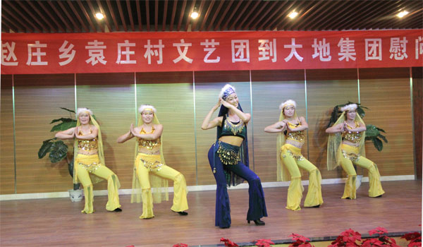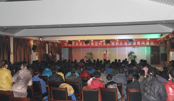 為活躍職工的文化生活,趙莊鄉(xiāng)袁莊村文藝團受大地集團之邀,2012年12月8日晚到大地公司友情演出。縣總工會主席郭鵬飛、縣政府黨組成員曲延輝、縣政府辦副主任李學(xué)敏、趙莊鄉(xiāng)袁莊村黨委書記袁軍國應(yīng)邀到場觀看,大地集團領(lǐng)導(dǎo)及職工200多人興致勃勃地觀看了演出。 寶豐縣的民間演出團體享譽省內(nèi)外,被譽為“曲藝之鄉(xiāng)”,袁莊村的文藝團就是其中的一支奇葩。演員們聲情并茂,繪聲繪色的演出令人久久回味,獨唱、舞蹈、魔術(shù)等富有民間色彩的優(yōu)秀文藝節(jié)目,贏得了觀眾的陣陣掌聲。在豐富職工業(yè)余文化生活的同時,也增強了企地間的文化交流和友誼。